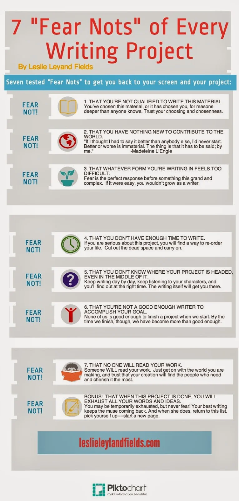6. Fear Not!—–That you’re not a good enough writer to accomplish your goal. None of us is good enough to finish a project when we start. Some of us aren’t even good enough to start! By the time we finish, though, we have become more than good enough. The struggle, the long hours and the word-wrangling and prayer-wrestling will all get you there.