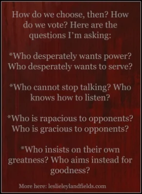 How do we choose, then? How do we vote? I can only speak for myself, but here are the questions I’m asking: