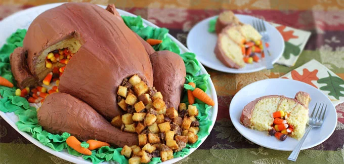 (Which do you prefer? A turkey cake with real turkey for the main dish or a turkey cake with real cake and fake turkey for dessert? Ugh, so many decisions!!)