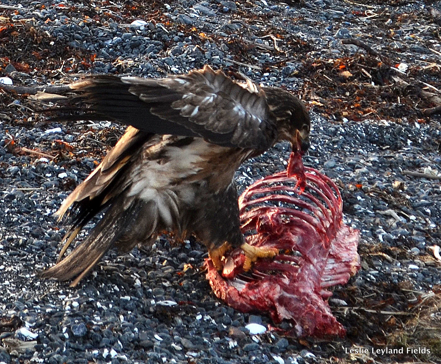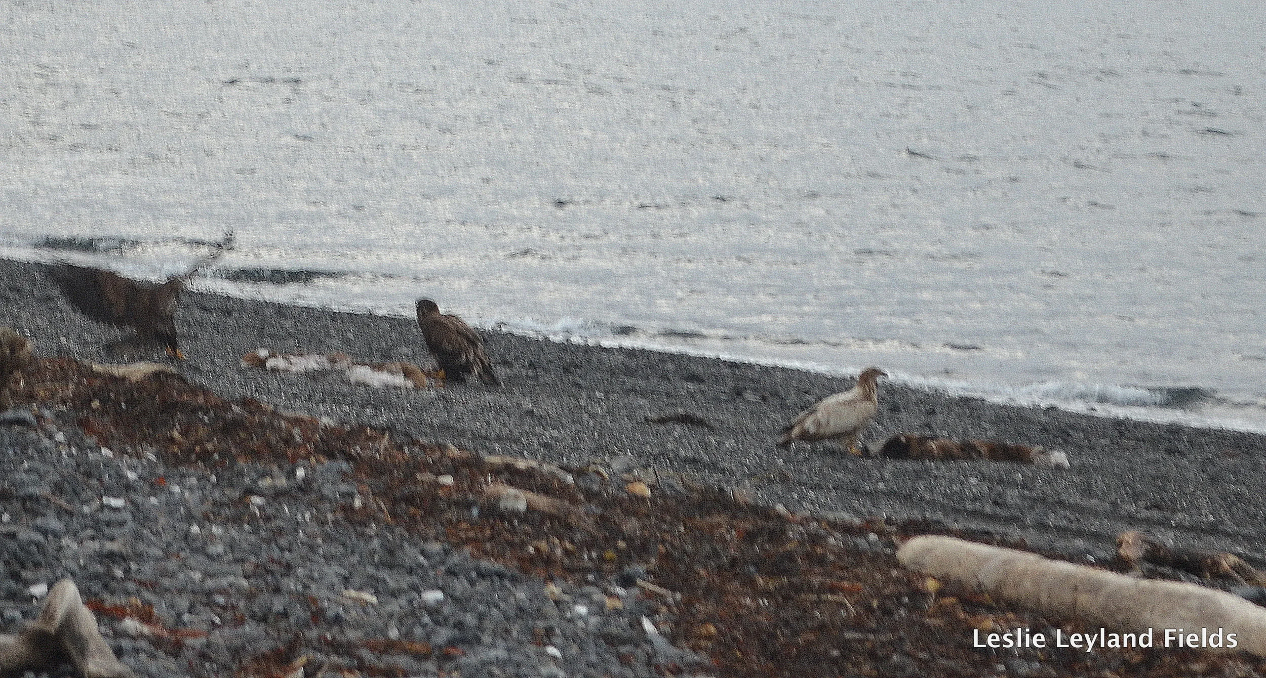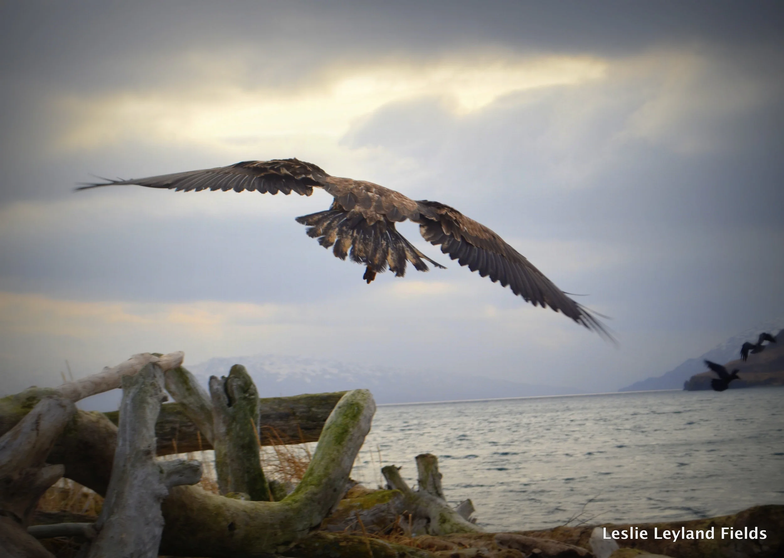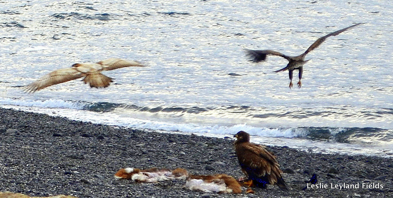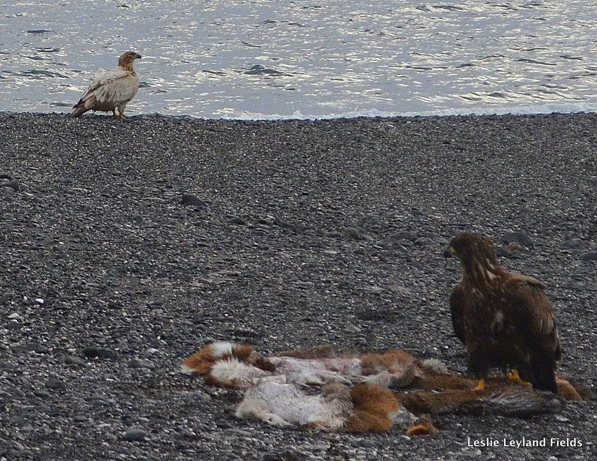 Bald eagles are our messy crows, they with their haunting and hovering over anything dead or dying. They are thick as fleas on Kodiak and on Harvester Islands, their screeches like rusty hinges we hardly even notice. But I do. I with my camera still notice, still watch and catch them close, and far, and in between. I cannot help it. (VIDEO: Here an immature is feasting on the remnants of our deer. Watch for the dogfight near the end.)