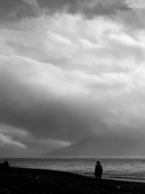 Out in the bay, I hear fin whales spouting, He rises and falls, feeding.