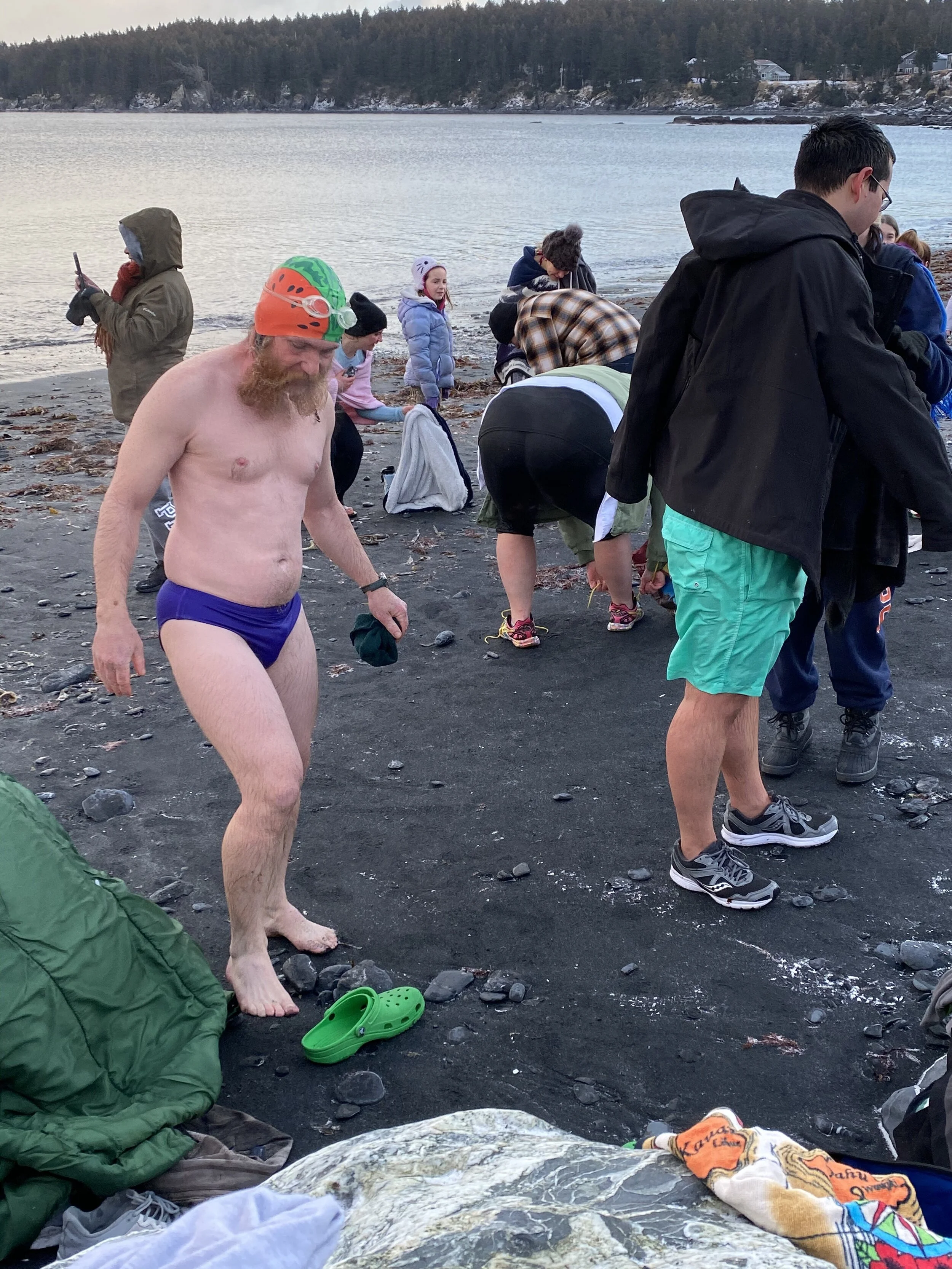 It’s 6 degrees in Kodiak this first day of 2020, with a wind chill much lower. (But we can’t complain. It’s -65 in other parts of Alaska right now.) In spite of the temps, a flock of hardy Kodiakans gathered in the frigid air, on the frozen beach. We all wore parkas, furs, scarves, boots. But as the clock ticked toward noon, about 60 people did the craziest thing.