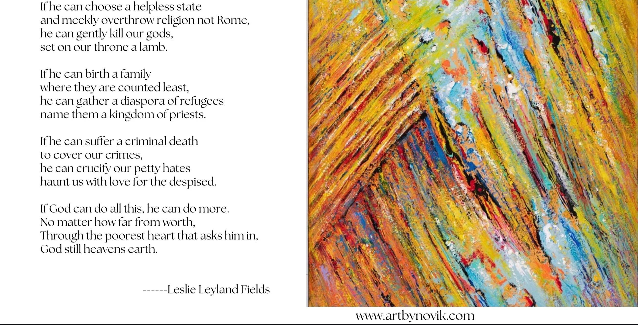 I did not expect it. That’s the definition of “surprise,” right? I needed new words for Christmas, to awaken my weary eyes. (Ach, Christmas already? Baby Jesus—-again?) But I had neither space nor time to write it. Then——out of unexpected sickness, confinement and sleeplessness——these words came. And joy comes again—-and again! Maybe for you too? (May I read it with you?)